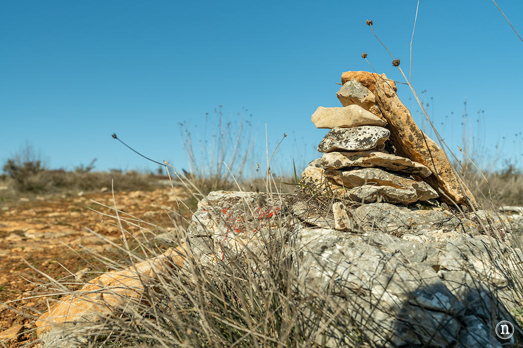Seguimos la pequeña senda que nos conduce a caminar por el borde del cañón siguiendo las señales que en ocasiones aparecen en el suelo o las rocas en forma de flecha roja o de hito.