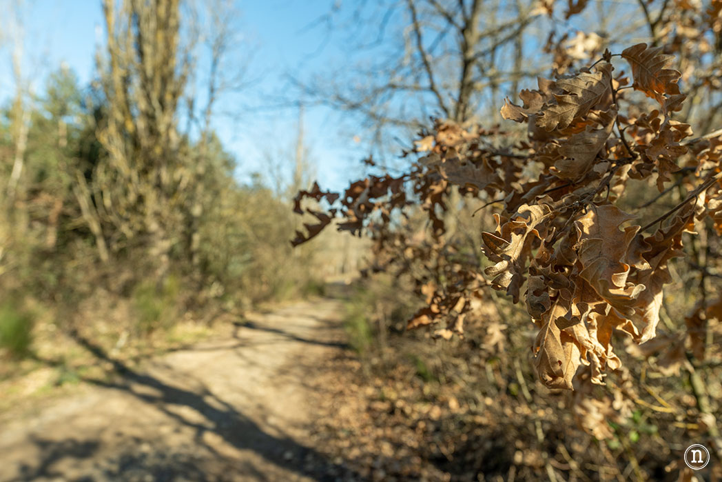 El camino empieza entre bosques donde abundan robles y chopos por una pista recta.