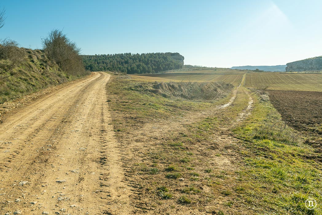 Nuestra intención es la de llegar lo antes posible a Villaescusa de las Torres, para visitar las Tuerces. Para ello debemos llegar hasta la pista que se encuentra a los pies del monte que vemos en la imagen.
