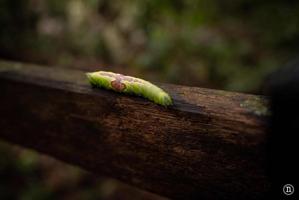 Metros más adelante y por la misma pasarela, nos encontramos un curioso gusano de color verde que lleva a su espalda lo que parece ser una cruz de Santiago en color marrón.