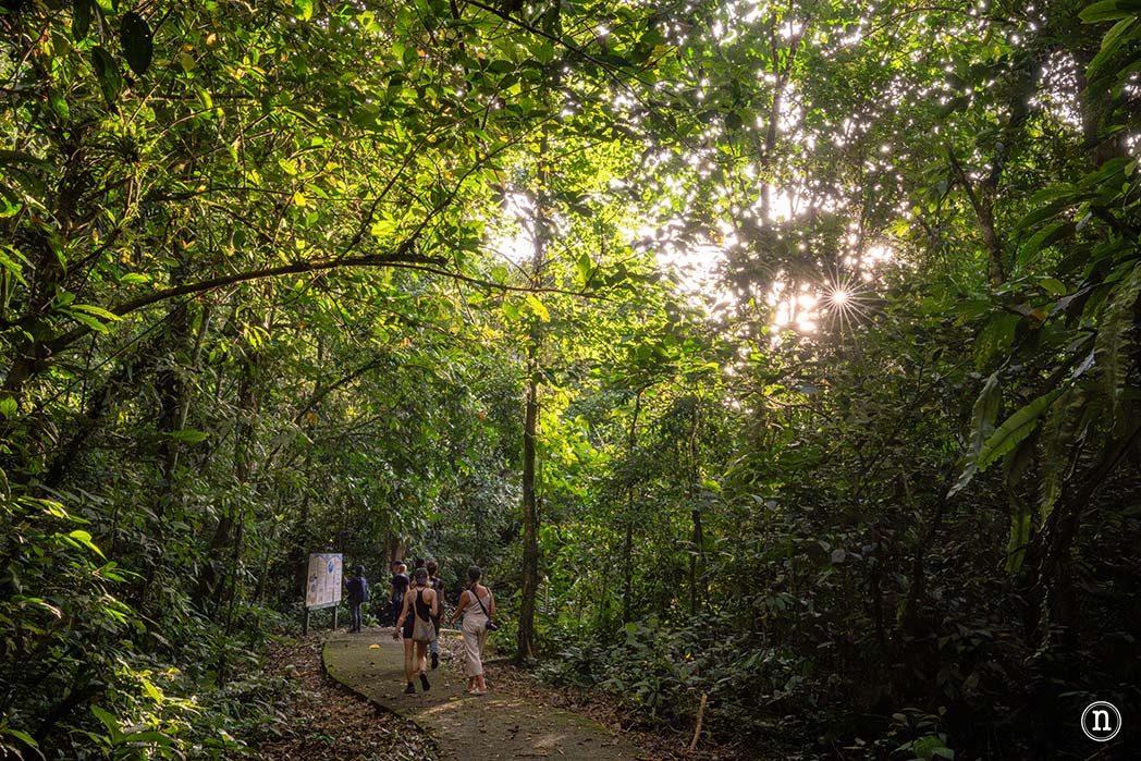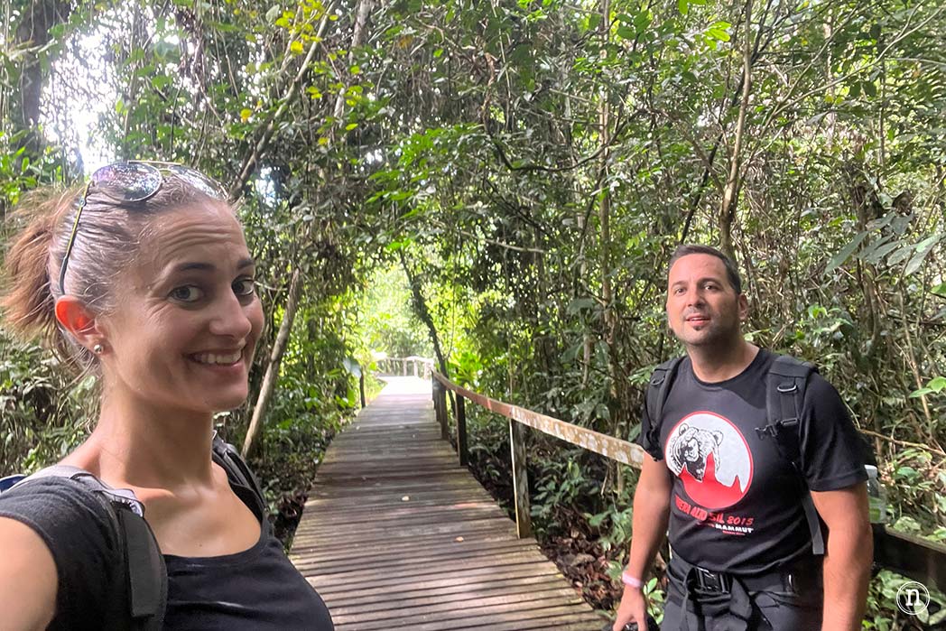 Nos dirigimos de forma tranquila por la pasarela de madera que nos trajo está aquí disfrutando de un día perfecto con una preciosa luz de atardecer que se filtra a través de los árboles y plantas propias de la selva tropical de Borneo.
