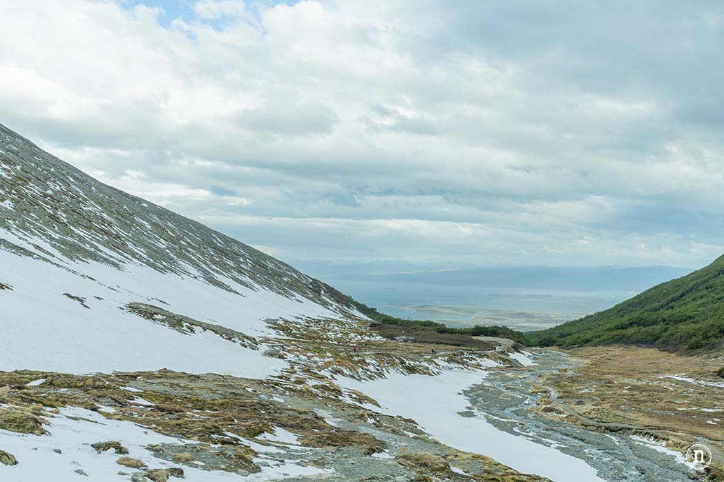 Tras poner punto y final a la ruta, iniciamos el camino de regreso hasta el aparcamiento donde nos dejó el taxi. De fondo, podemos observar el aeropuerto de Ushuaia y los Dientes de Navarino, ya en territorio chileno.