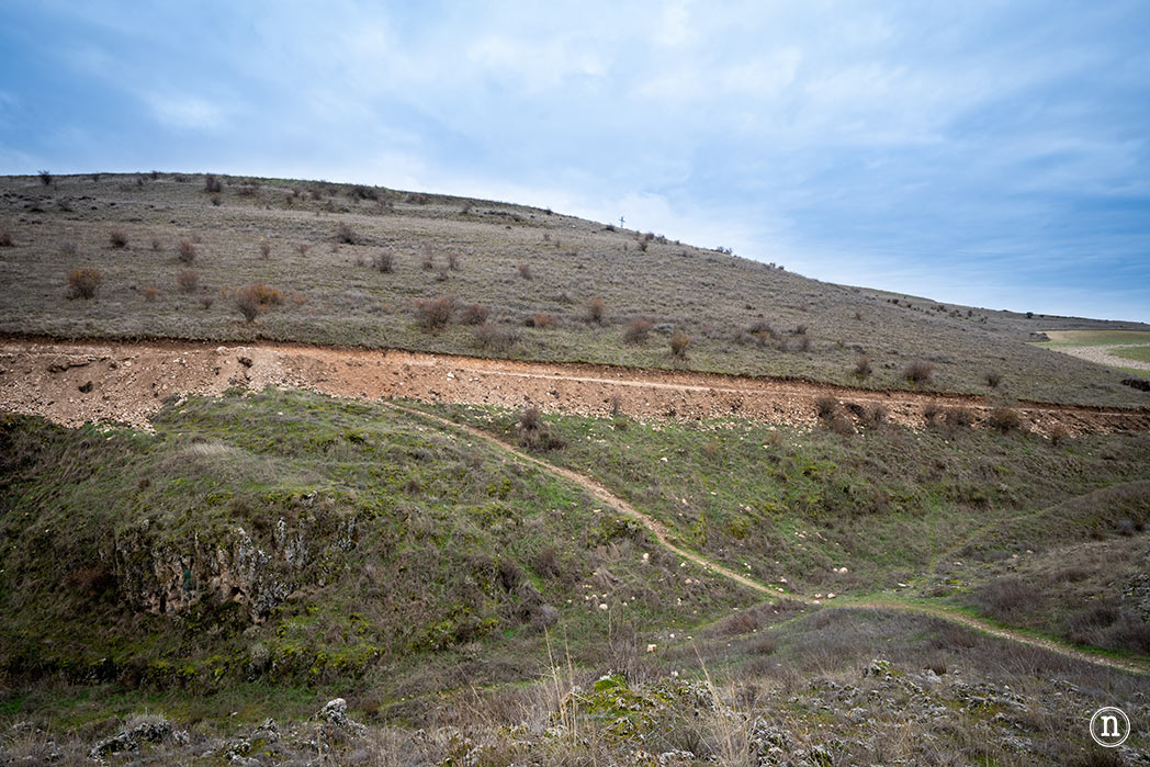 Junto a las ruinas de las ermitonas hay dos caminos. Uno de ellos es más ancho y que parece que, al limpiarlo, han tapado una pequeña senda que sale a la derecha. Este sendero es el que debemos seguir.