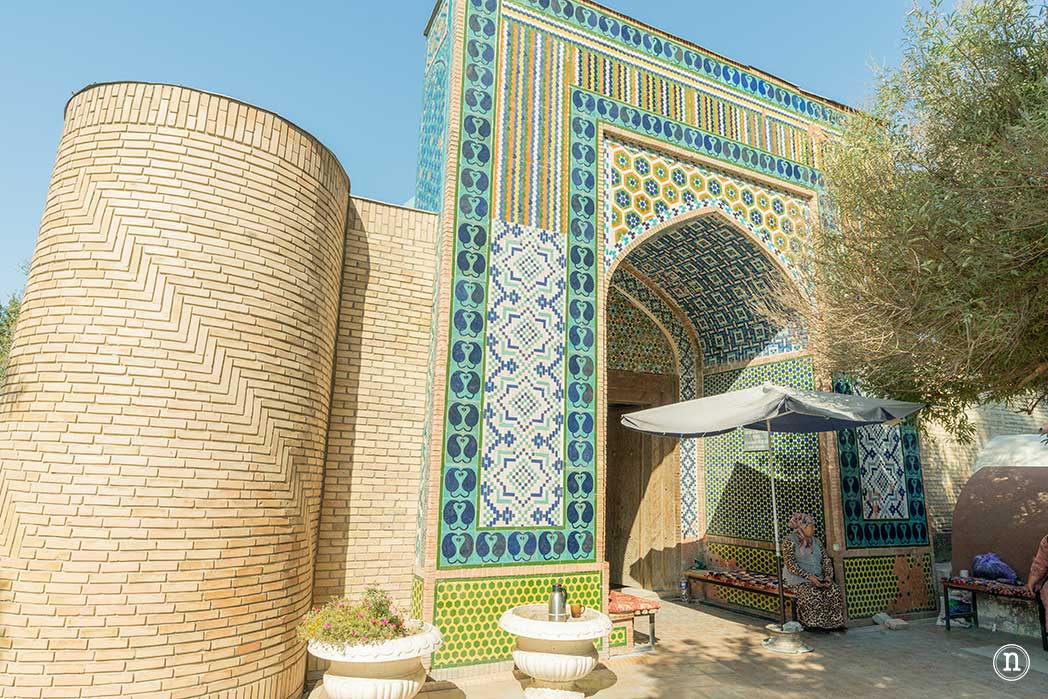 Junto a la puerta del mausoleo, una señora nos ofrece un masaje Uzbeko. Si pasas por aquí intenta hacer tiempo para ver cómo uno y otro uzbeco que visita al cementerio pasa por sus manos ¡menudos golpes que les da! Esta tumba, es la de una poetisa ejecutada por el emir de Bujará.