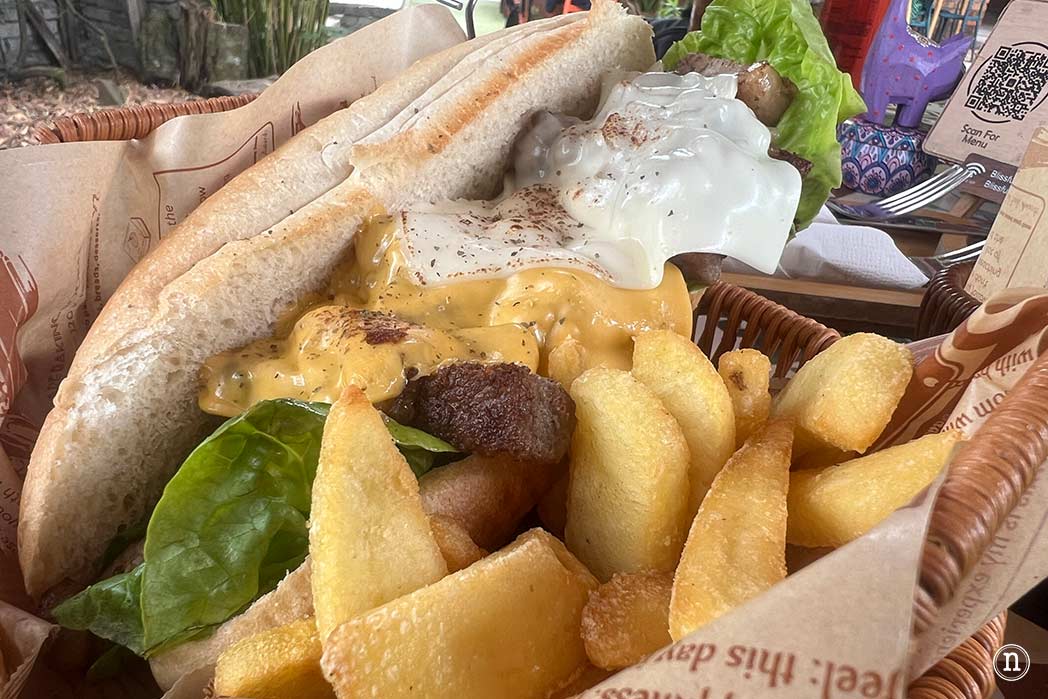 - Steak sándwich con patatas formado por bistec de solomillo australiano de 140 g, 2 quesos y cebolla a la parrilla 38 RM (7.60 euros).