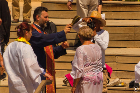 En las aguas del Río Jordán, en la orilla del lado israelita, tiene lugar el bautismo de un grupo de fieles. Como vemos, no quieren dejar pasar el momento, posando para la foto.