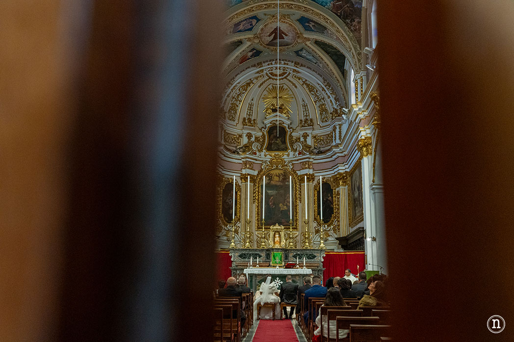 Por una rendija de la puerta, nos asomamos a su interior. Nada más acercarnos, escuchamos que se encuentran en misa, cuando nos asomamos, descubrimos a una pareja de novios que se encuentran en medio de la ceremonia nupcial.
