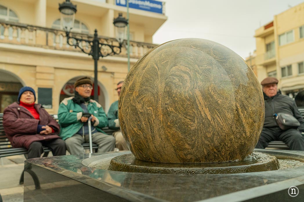Junto a la tienda de dulces típicos y frente a la iglesia, encontramos esta curiosa obra. Se trata de una bola de mármol, aparentemente movida por el agua.