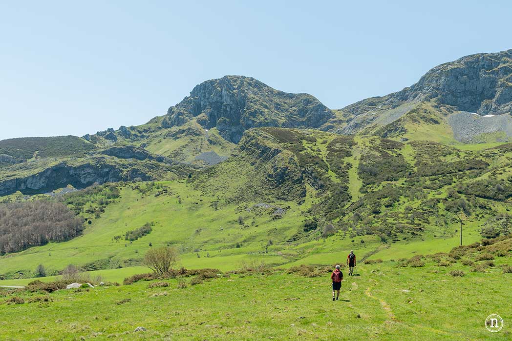 Tras un pequeño repecho, llegamos a un tramo tranquilo y llano junto a las grandes moles de roca qué conforman las montañas de León y por dónde las escorrentías discurren a su antojo haciendo que, irremediablemente, nos mojemos los pies. El terreno, que es muy permeable, hace que parezca que caminamos sobre una gran esponja verde.