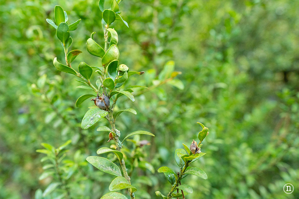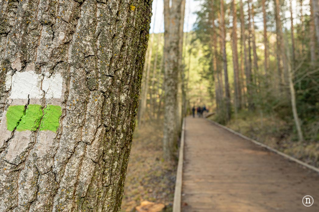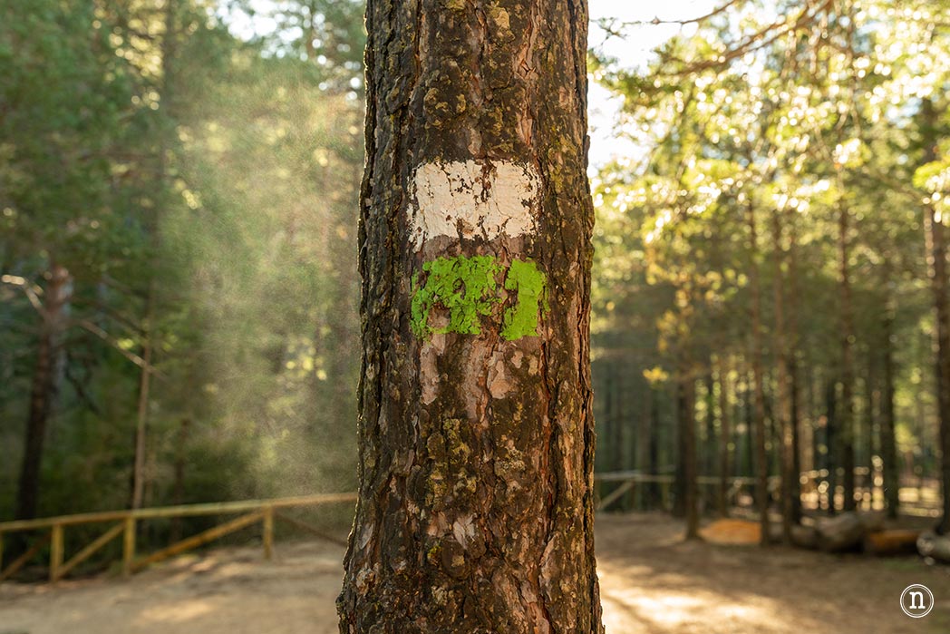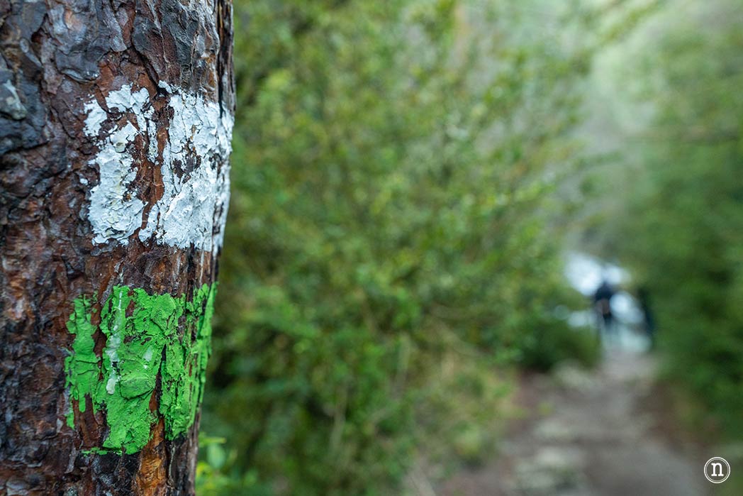 Entre barandillas y pasarelas de madera, pinos y arbustos de boj, avanzamos. Cada pocos metros nos encontramos con las señales blancas y verdes, indicativo de que vamos por el camino correcto.