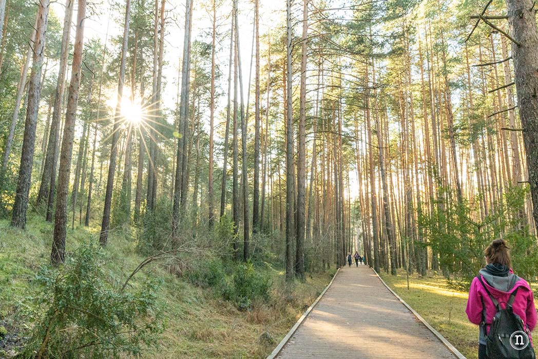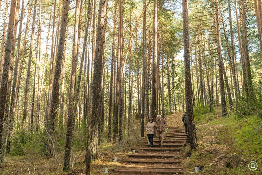 Miramos el reloj cuando llegamos al aparcamiento y es casi mediodía. Ante nosotros se abre el bosque de pinos que nos invita a pasar mediante una pasarela de madera.