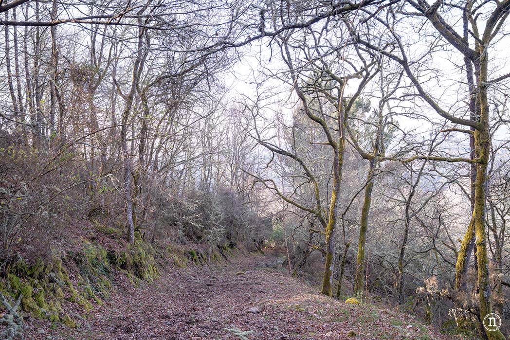 Desde este punto, comienza otro tramo de subida, un pequeño repecho de terreno totalmente despejado. Este camino se convierte a su vez en otro sendero que asciende serpenteante, tapizado de musgo y liquen, que se encuentra embarrado y resbaladizo debido a la mezcla de agua y hojarasca.