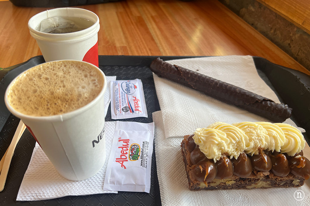 Los precios del restaurante, para ser un lugar tan turístico, son bastante aceptables. Nosotros probamos los cubanitos, un rollo de hojaldre relleno de dulce de leche, que nos costó 900 pesos argentinos o lo que es lo mismo, 0,90 €. El té vale exactamente lo mismo, 900 ARS, el café con leche vale 1200, el alfajor 1500 y los brownies 2300. Algunas personas compraban bocadillos para llevar en su trayecto, pero nosotros teníamos aquellas empanadillas que compramos el día anterior y de las que ya os hemos hablado. (link interno)