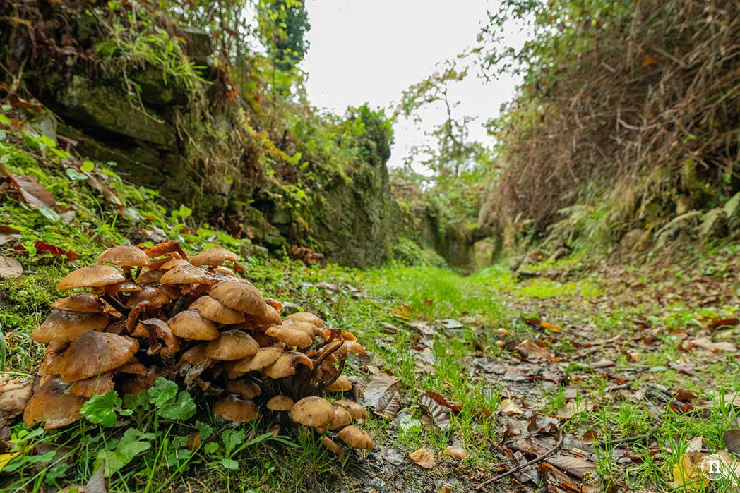 El camino se estrecha por momentos y en ocasiones el sendero parece desaparecer entre las hierbas. La humedad que reina en este entorno crea una escena de naturaleza salvaje donde aparecen algunos edificios que parecen ser engullidos por las plantas creando un ambiente de misterio.