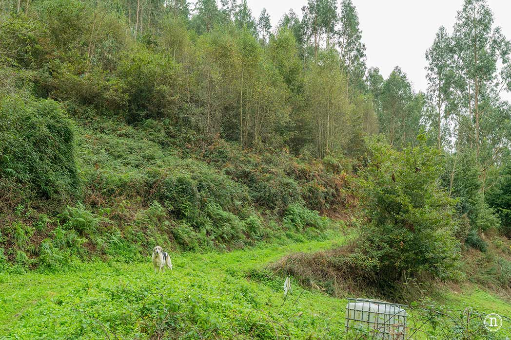 Mientras avanzamos y hablamos tranquilamente, escuchamos los ladridos de un perro que ha salido de una finca cercana con cara de pocos amigos. Nos detenemos y pensamos si dar la vuelta. Retrocedemos y al cabo de unos metros, giramos la cabeza. Tras minutos de tensión, decidimos hablarle al perro para medir su estado de ánimo.