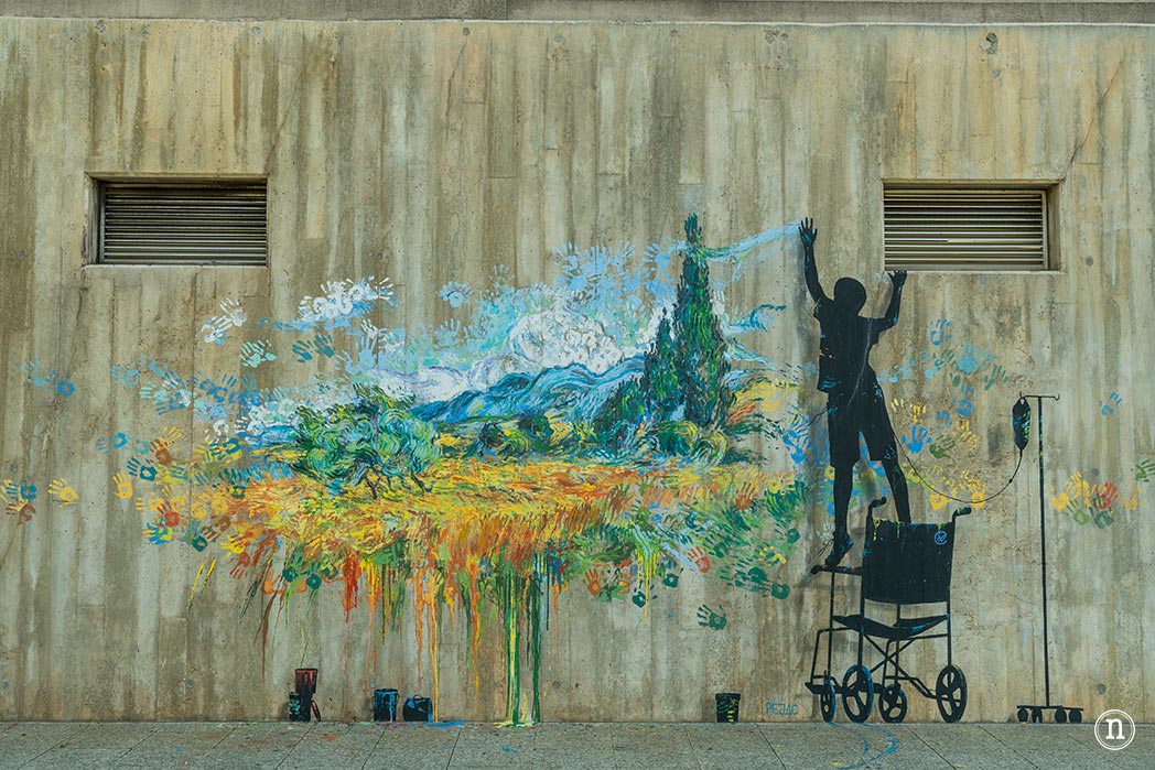 El artista cántabro Pejac ha realizado tres murales para su proyecto Fortaleza con la intención de agradecer al hospital su lucha contra la COVID-19. Como resultado podemos encontrar tres cobras cuyos títulos son Caricia, Social Distancing y Superación.