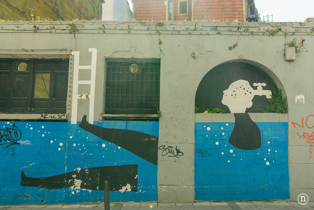 Este mural que es obra de la valenciana Patricia Bolinches y el madrileño Luis García recuerda el manantial que fluye por debajo de las aceras de esta calle Rio de la Pila.