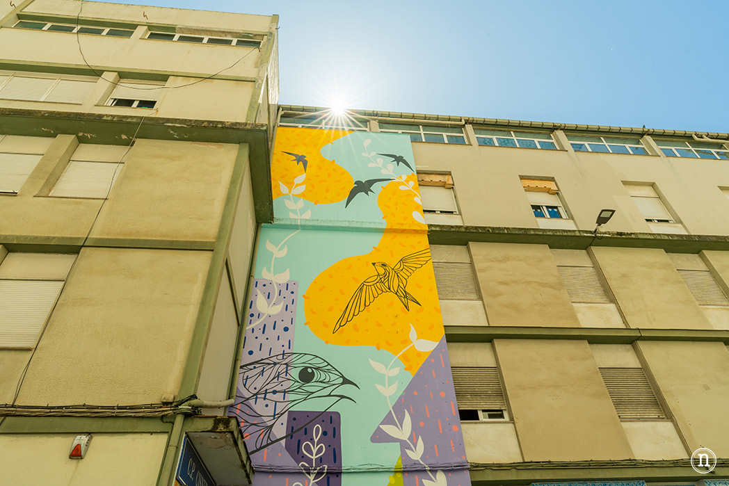 La primera de ellas representa el vuelo de varios vencejos, libres como la imaginación. Tal como nos indica una lectora, este mural forma parte de un proyecto del CEIP Cisneros en colaboración con la asociación SeoBirdlife, donde también se colocaron unas cajas para albergar los nidos de estas aves y su posterior estudio.
