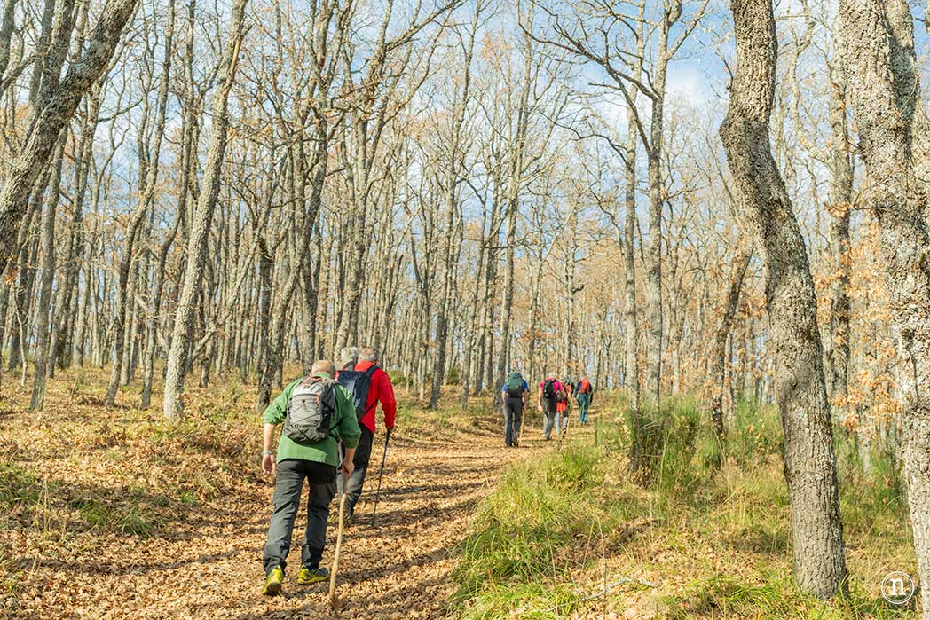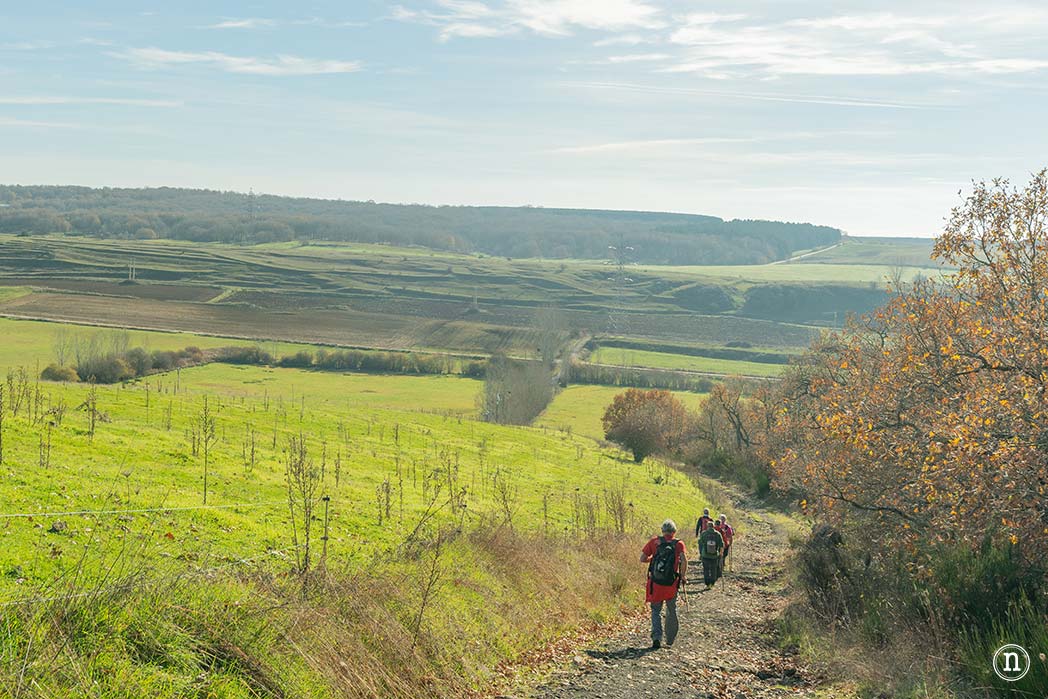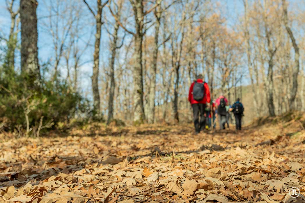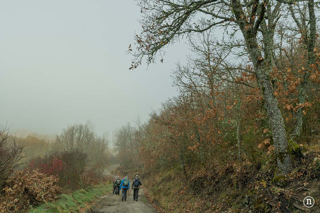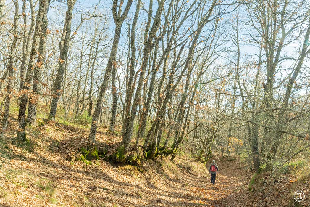 Tras la subida, llegamos a una suave pendiente descendente entre la hojarasca procedentes de los enormes y espigados robles que nos escoltan a ambos lados del camino.