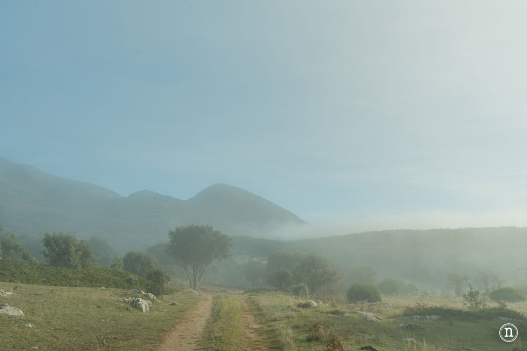 Salimos a un claro del bosque donde nos vemos rodeados entre montanas y comprobamos alegres y aliviados como poco a poco se disipa la niebla.