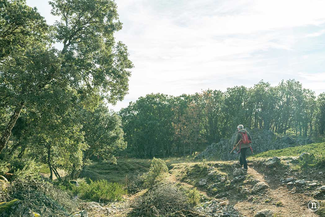 Poco a poco, volvemos a perder altura para dirigirnos a la zona llamada Campos de la Peña de Muñeca. Para alcanzar este paraje debemos caminar por un sendero de escorrentía al abrigo de las encinas las cuales producen divertidos juegos de luces a medida que filtran la luz del sol.