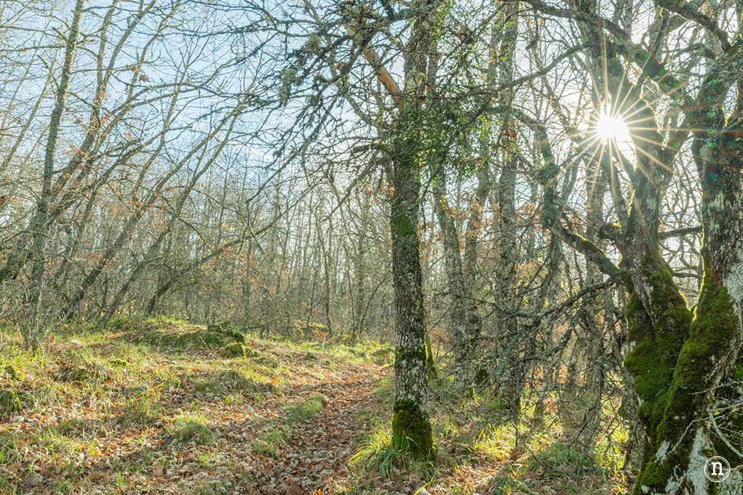 Una vez que ha salido el sol, el encinar nos devuelve sus tonos verdosos, algo de agradecer tras caminar entre las hojas caducas del robledal.