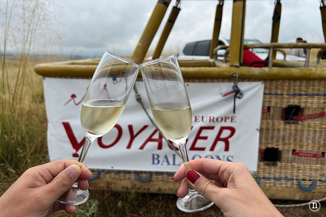 Tras el picoteo y las bromas que acompañan los momentos posteriores al vuelo, brindamos con vino espumoso de la zona para que el deseo de regresar pronto pueda cumplirse.